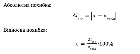 Визначити відносну та абсолютну похибку вимірів, порівнявши з табличним значенням.